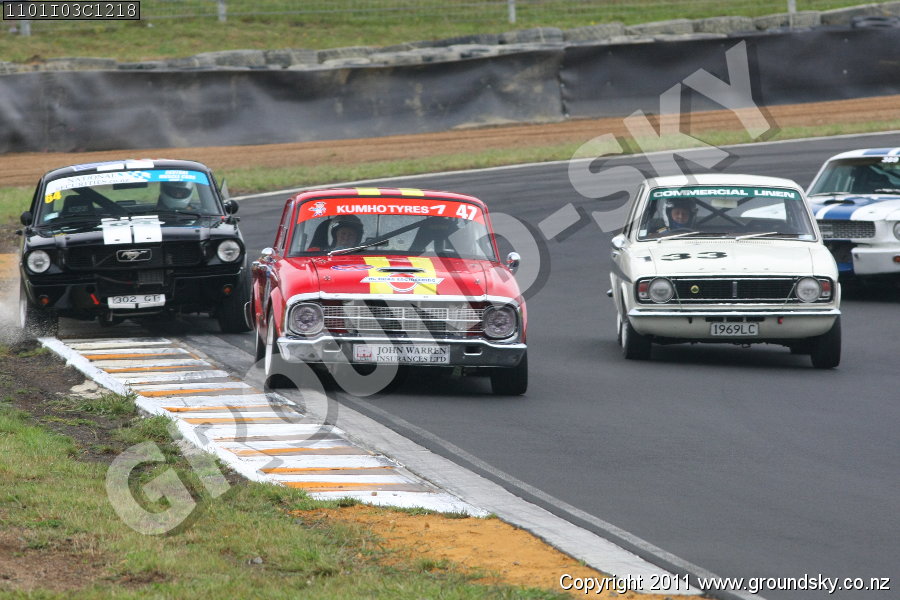 Car No: 33 Bill Cottle - Ford Anglia 105E - Car No: 47 Peter Stevenson - Ford Falcon XM - Car No: 64 Bruce Dreadon - Ford Mustang - NZ Festival of Motor Racing Week 1 - Invited 1960s Saloons & GTs