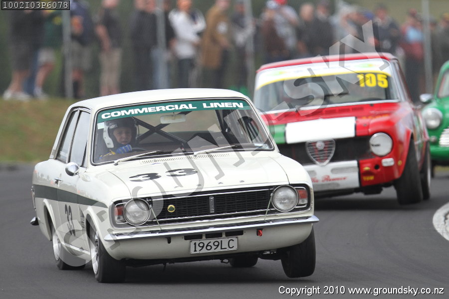 Car No: 105 Arthur Vowles - Alfa Romeo Giulia Super - Car No: 33 Bill Williams - Ford Lotus Cortina Mk2 - NZ Festival of Motor Racing Hampton Downs - Invited 1960s Saloons & GTs