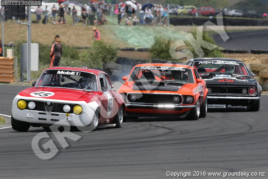 Car No: 23 Dale Mathers - Ford Mustang Boss 302 - Car No: 3 Kevin Gimblett - Chevrolet Camaro - Car No: 45 Scott O'Donnell - Alfa Romeo GTAm - NZ Festival of Motor Racing 2016 Week 1 - Historic Muscle Car