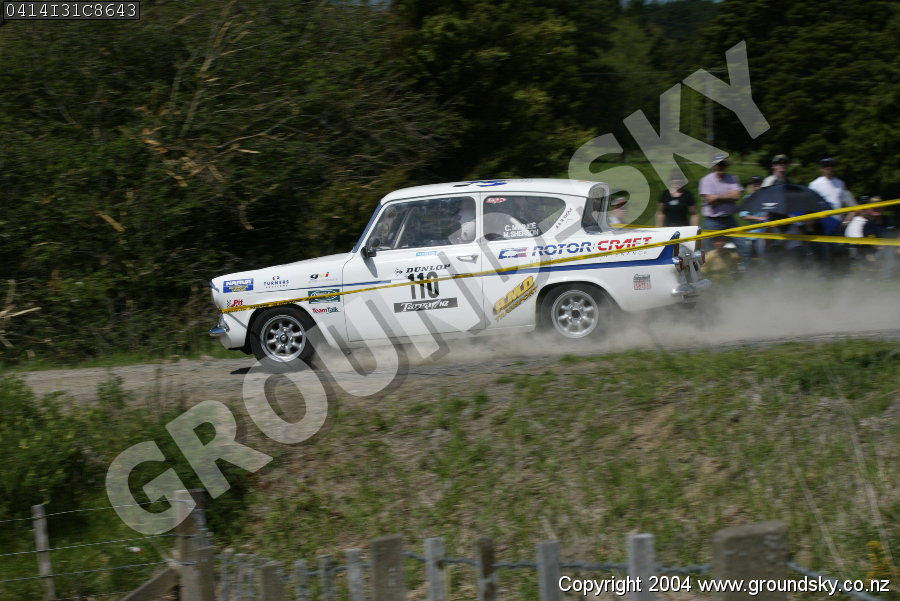 Car No: 110 Chris Minnee and Mark Sherson - Ford Anglia 105E - Dunlop Targa New Zealand 2004 - Special Stage 31