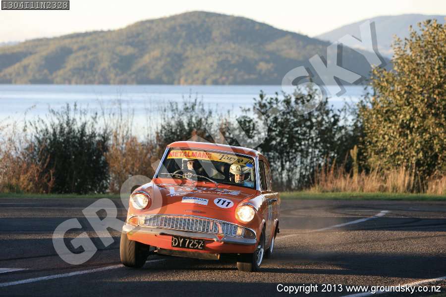 Car No: 111 Dennis Dowling and Suzannah Dowling - Ford Anglia 105E - Targa Rotorua 2013 - Special Stage 11